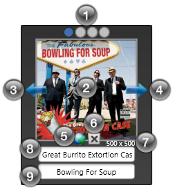 Artwork Results A circle represents one album artwork search result.  Clicking on the circle will change album artwork displayed and make it the selected album artwork to be saved.  When selecting the dimensions of the newly selected search result will be shown below the bottom right of the artwork.