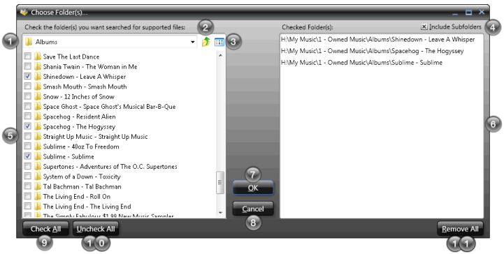 N/A Folder Selection List Shows a list of folders that correspond to the Current Folder Location.  Check the boxes to the left of the folder names to add the folder to the Checked Folder List.  All checked folders will then be searched for supported files that will be added to the Album List after clicking OK.